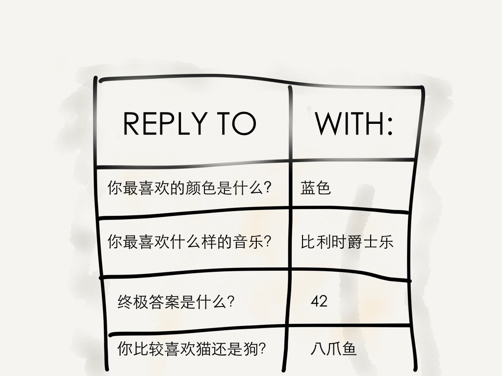 So if someone posts you a note saying 你最喜欢的颜色是什么?, you would know to reply with 蓝色 just because the instructions say so. Although you’ve given the person on the other side of the door an answer, you don’t know what the question was, and you don’t know what you’ve answered!