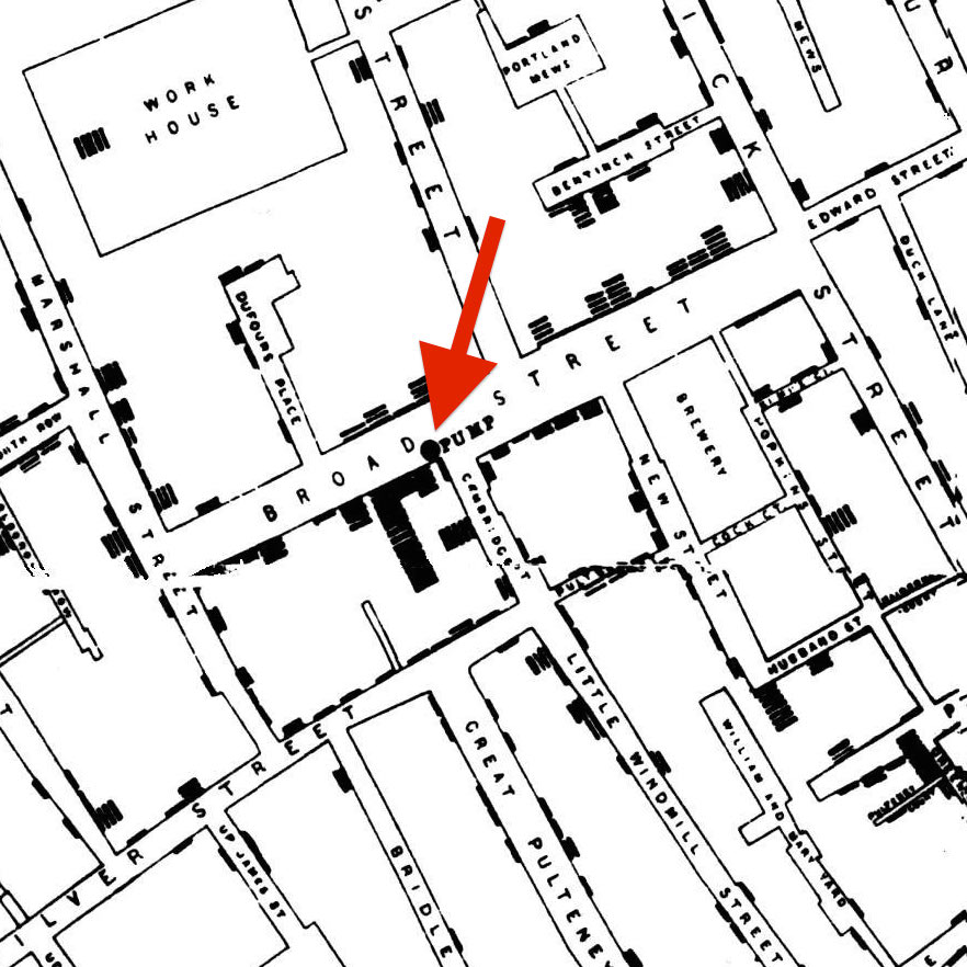 The map John Snow used. The black bars show where people had caught cholera. We’ve drawn an arrow pointing to the pump.